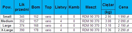 Bardzo zwarty, czterolistwowy żagiel wave na zróżnicowane warunki wietrzne i zafalowania. Jego konstrukcja zapewnia zachowanie dużej siły ciągu i łatwości manewrowania. Szeroka możliwość trymowania umożliwia dostosowanie go do różnej siły wiatru. Kewlarowe wzmocnienia gwarantują bardzo dużą wytrzymałość przy jednoczesnej redukcji ciężaru.Dane techniczne
